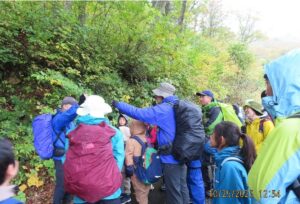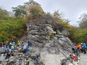 曇り予報ながら、開会式から霧雨。それでもどうにか岩登りができそうなので、2班で岩登りと自然観察の入れ替え方式を、午前中全員岩登り、午後全員で自然観察と変更して実施した。