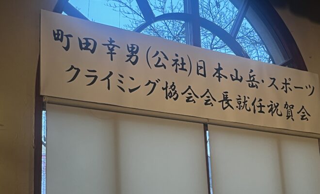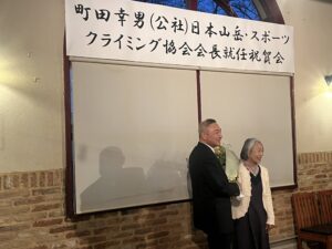祝賀会発起人で同協会・群馬岳連の八木原圀明顧問は、登山界の変化と課題とともに町田新会長への期待と祝意を述べ、それに対し町田会長は「登山界は今、まさしく過渡期にある。先人が築き上げた山の文化を大切にし、安全登山の啓発とスポーツクライミングの発展に尽くしていく」と覚悟を語った。