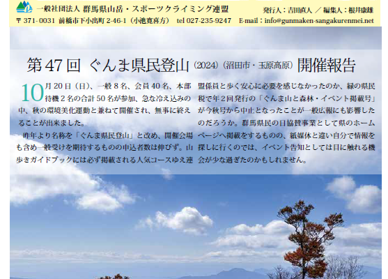 『山岳ぐんま』132号を発行しました(10月31日)。10月20日に行われた「県民登山」や今年度の登山教室の実施報告と参加者のアンケート結果、8月に行われたチャレンジキッズプロジェクト「野反湖登山とキャンプ」の模様などを詳報。A4判10…